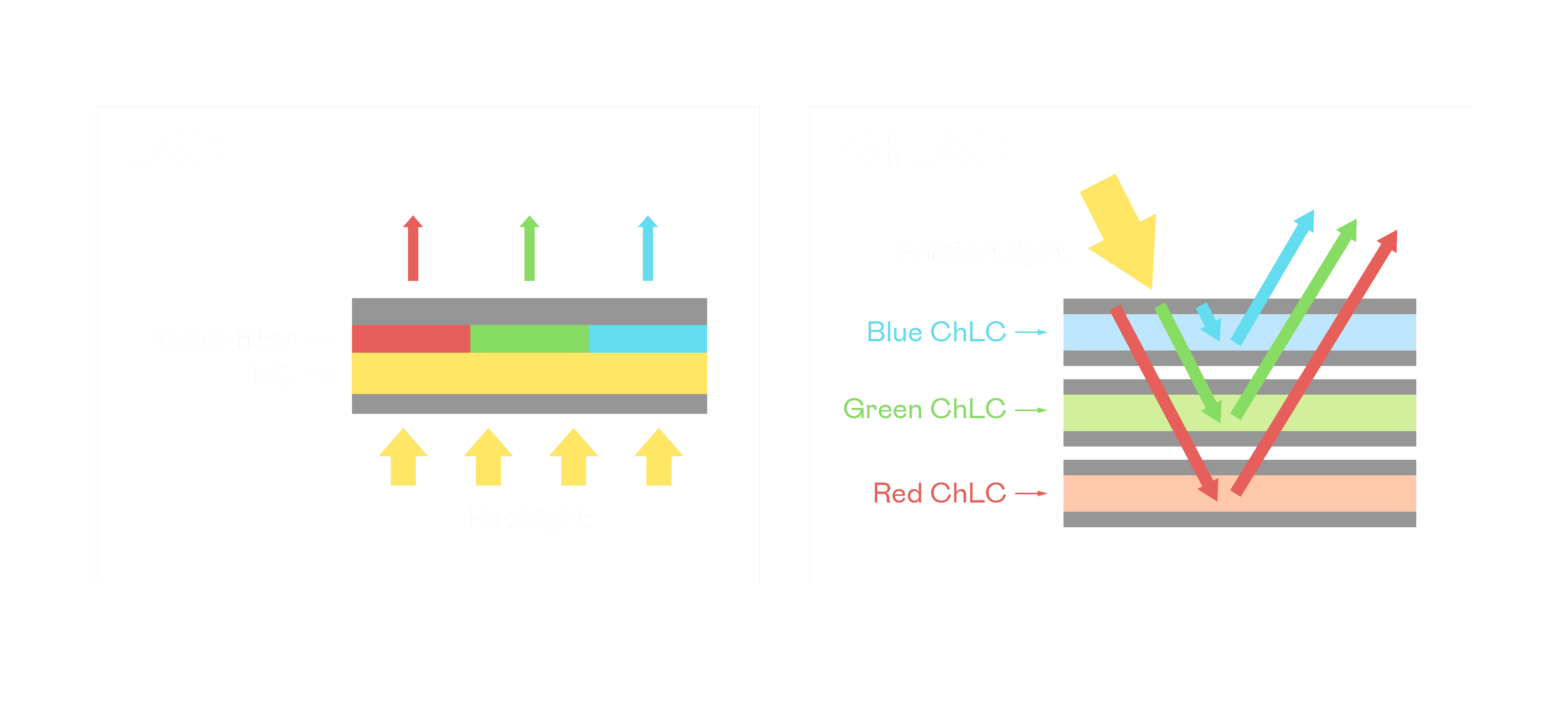 ChLCD 胆固醇液晶就如同纸张一样,,透过反射环境光来显示影像,,,,因此长时间观看不易造成人眼视觉疲劳,,可达到护眼效果。。。当处于户外阳光下使用,,LCD 影像容易失真而不易观看,,,但胆固醇液晶仍可维持较佳的影像品质。。